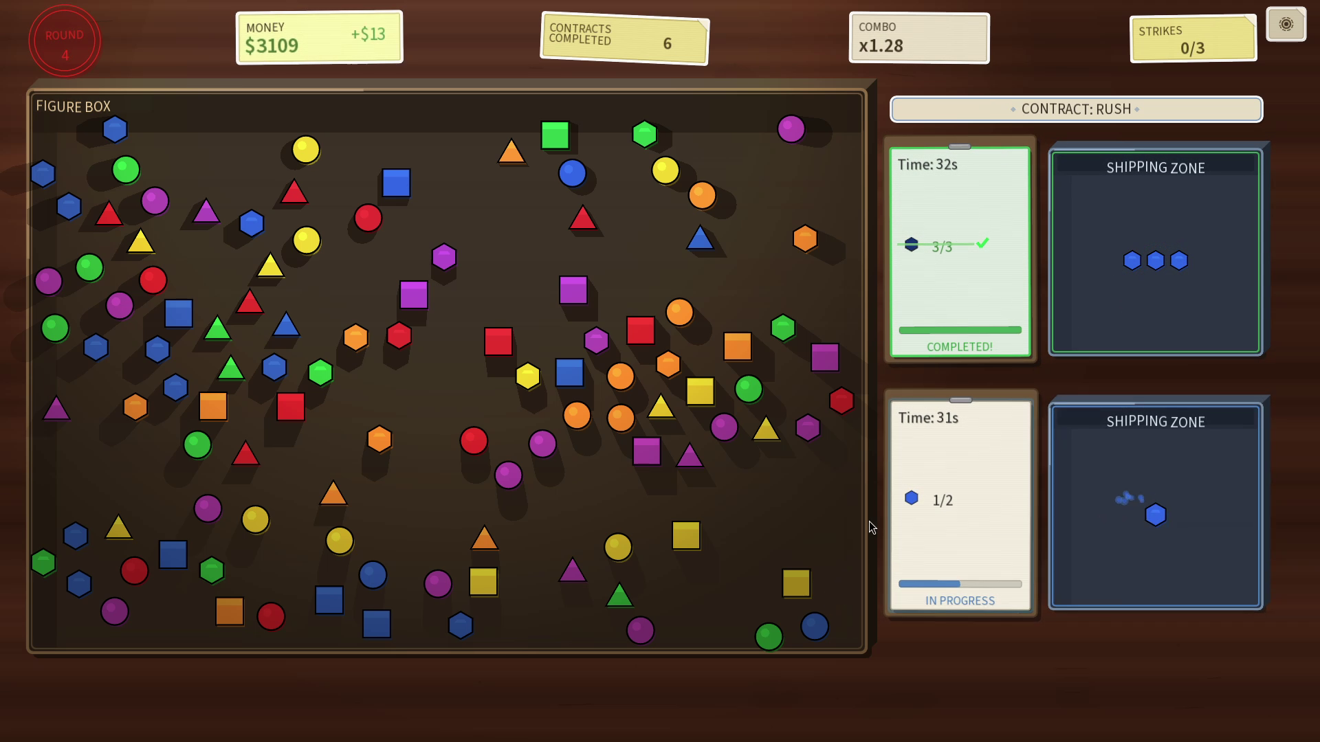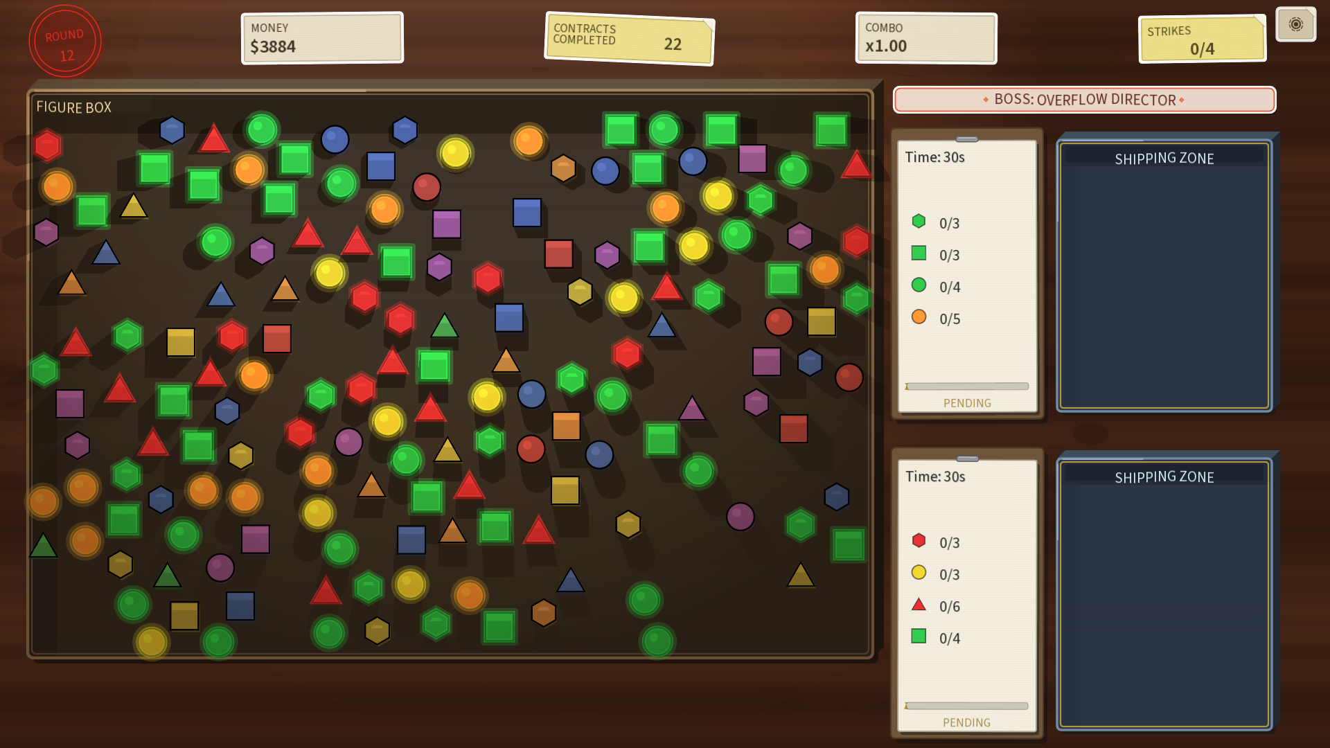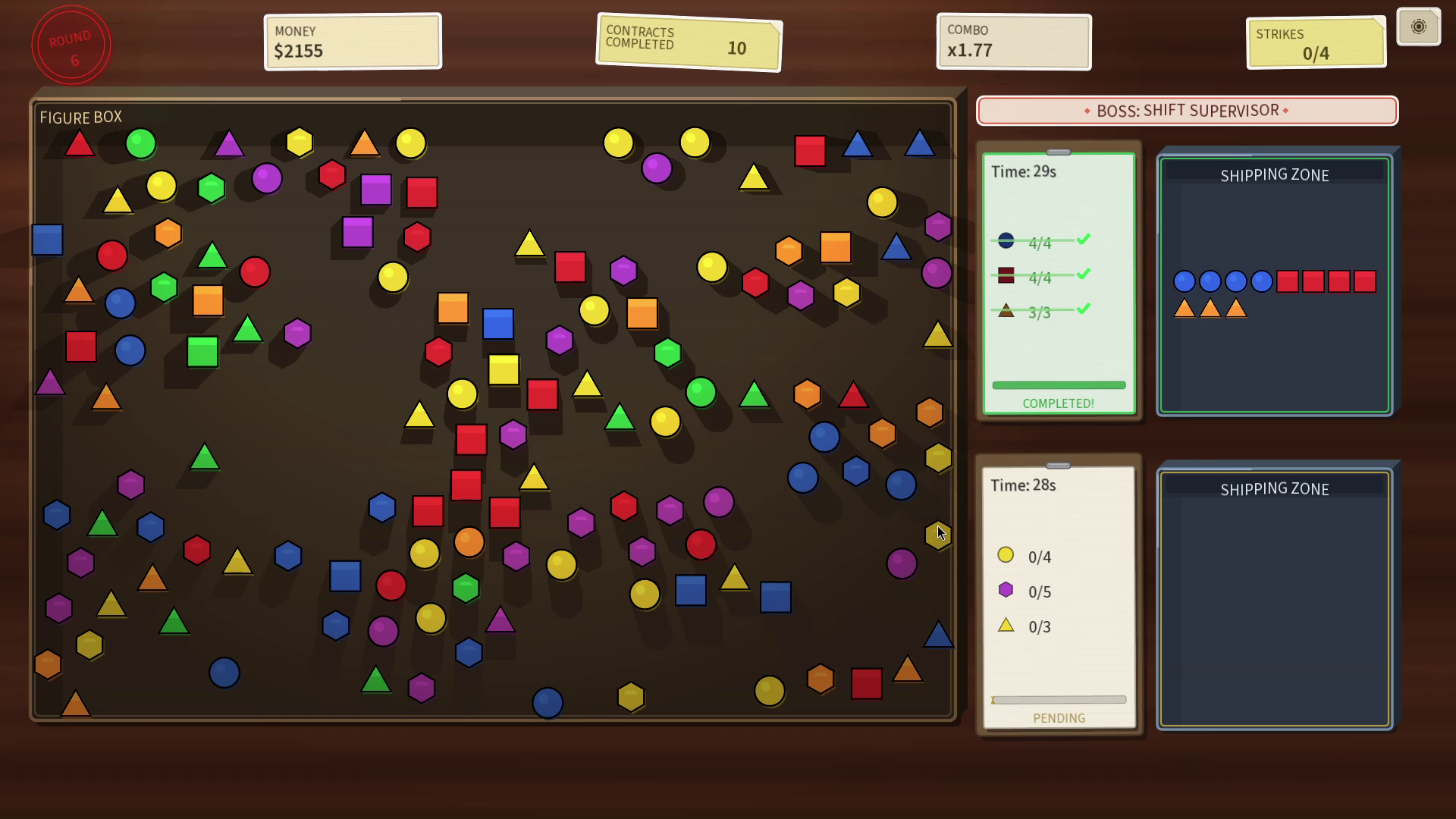 In this fast-paced roguelite, you run a chaotic sorting desk where every second counts. Match figures by shape and color, fulfill contracts before time runs out, and protect your limited strikes.