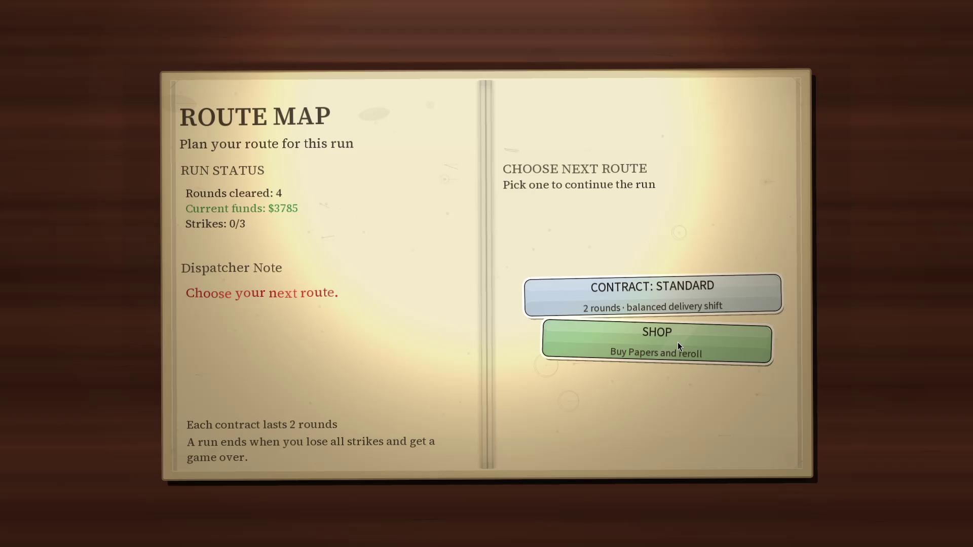 Each run unfolds on a sticker-based route map spread across your desk books. Choose your path through standard contracts, elite encounters, bosses, shops, events, and treasure nodes. Discover and unlock Papers (modifiers) that stack into powerful synergies and radically change your strategy from run to run.